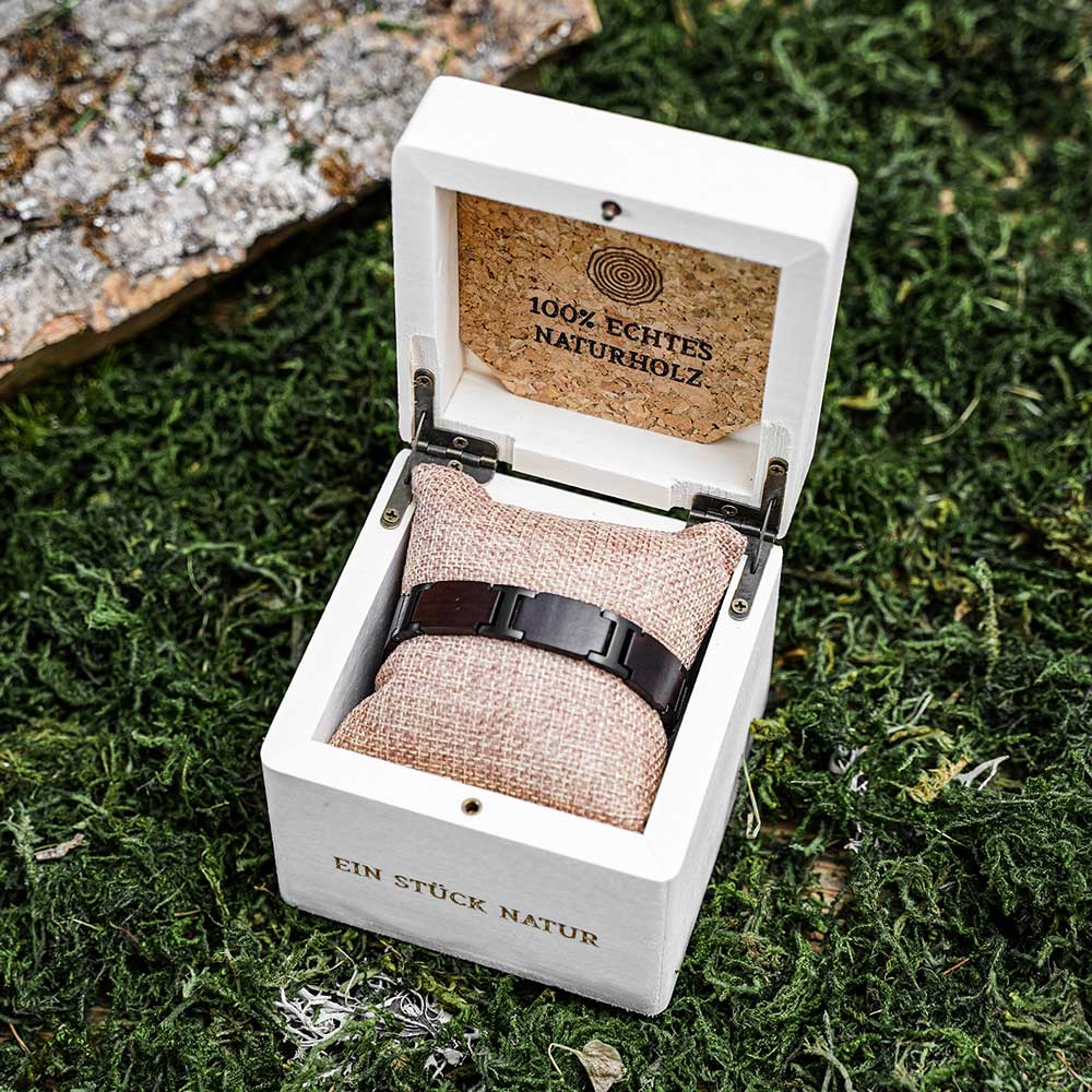 Zeitlos schönes Armband aus 100% umweltfreundlichen Natur Holz und silbernen Edelstahl. Das modische Armband kann mit einer Monogramm Laser Gravur zu einem echten Unikat gestaltet werden und eignet sich perfekt als Geschenk. Jedes Armband wird handgefertigt und liebevoll verpackt für den perfekten Geschenkmoment.