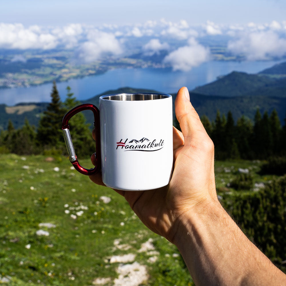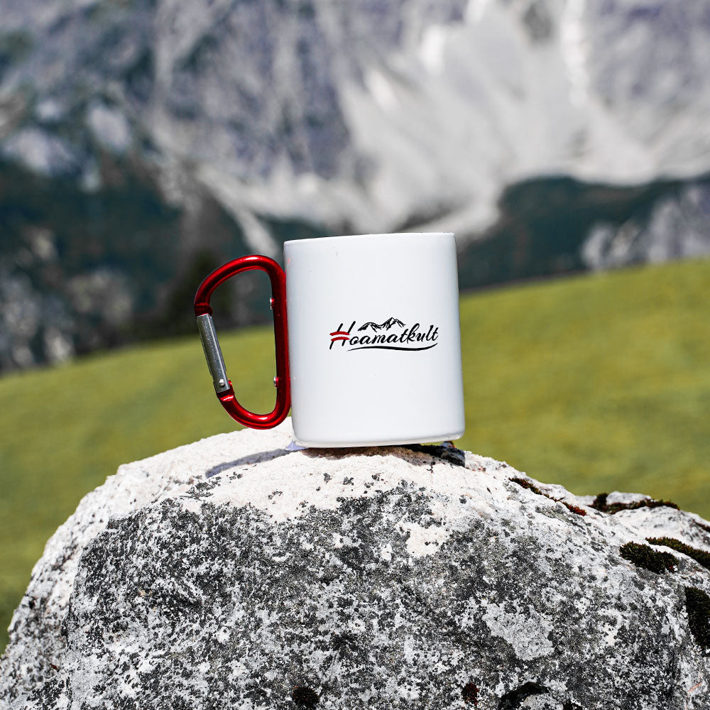Genieße dein Lieblingsgetränk auf der Bergspitze aus dem Karabinerhäferl und bewundere deine Aussicht - für unvergessliche Gipelmomente.
