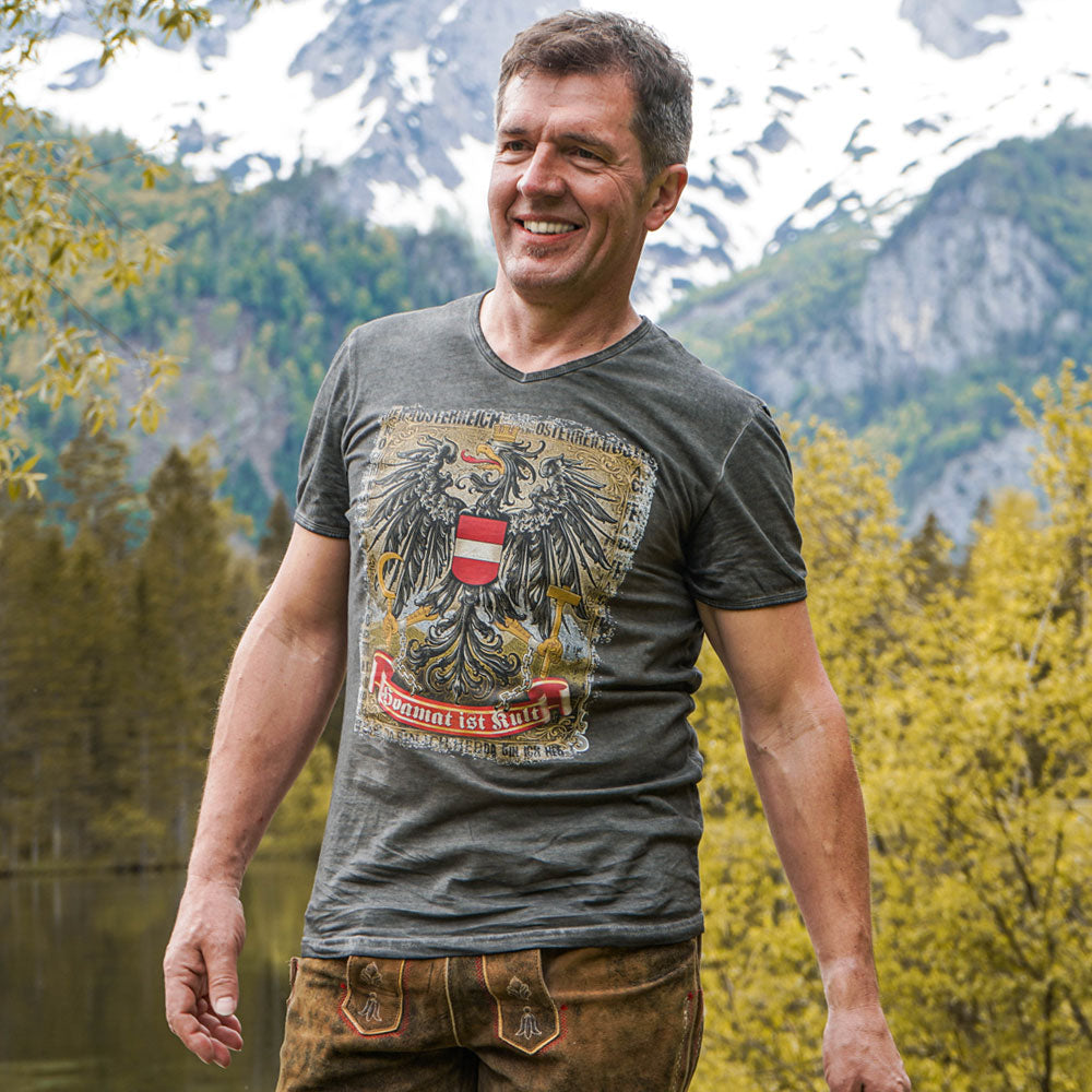 Trendiges Designer T – Shirt im lässigen Vintage Look mit Österreich Adler Druck. Gut kombinierbar mit der Kultjacke und Lederhose. Trachtiges T-Shirt, welches auch im Alltag gerne getragen wird.