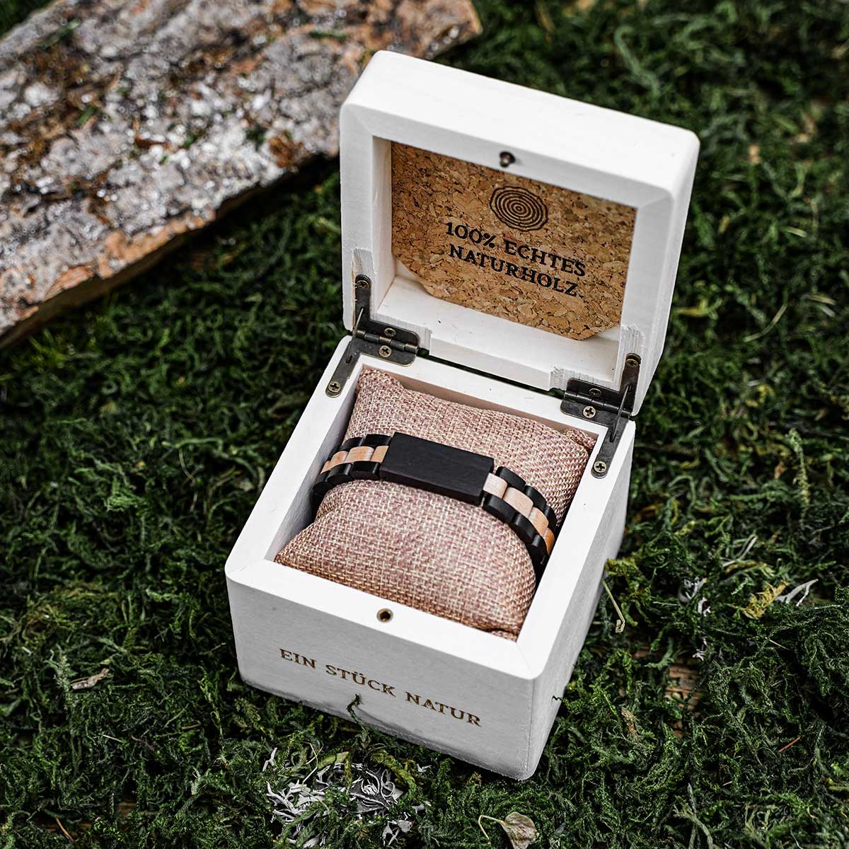 Das modische Armband aus kontrastfarbigen Naturholz ist ein echter Hingucker und ein richtiges Unikat. Handgefertigt aus reinem Naturholz überzeugt das Holzarmband durch makelose Qualität und umweltfreundliche Verarbeitung. Durch das individuelle Glieddesign kann das Armband leicht in der Länge angepasst werden und ist somit für jedes Handgelenk geeignet. Die sichere Faltschließe aus Edelstahl sorgt für ein angenehmes Tragegefühl und lässt sich besonders bequem öffnen und schließen. Mit einer individuellen Laser Gravur kannst du dein Armband zu einem echten Unikat machen und deine Liebsten so richtig überraschen.