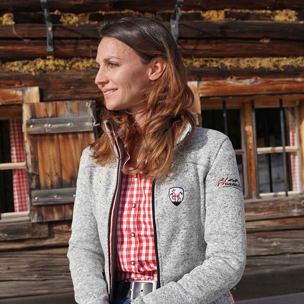 Für alle "Bambis"! Tailliert geschnittene Strickfleece Jacke mit trachtigen Karo Applikationen und edler Hirsch Wappen Stickerei. Die weiche und wärmende Trachtenweste passt perfekt zur Tracht und ist ideal kombinierbar mit einer lässigen Trachtenbluse und Lederhose. Die karierte Damenjacke mit Kapuze wird in unserer hauseigenen Stickerei liebevoll veredelt und kann auf Wunsch personalisiert werden.