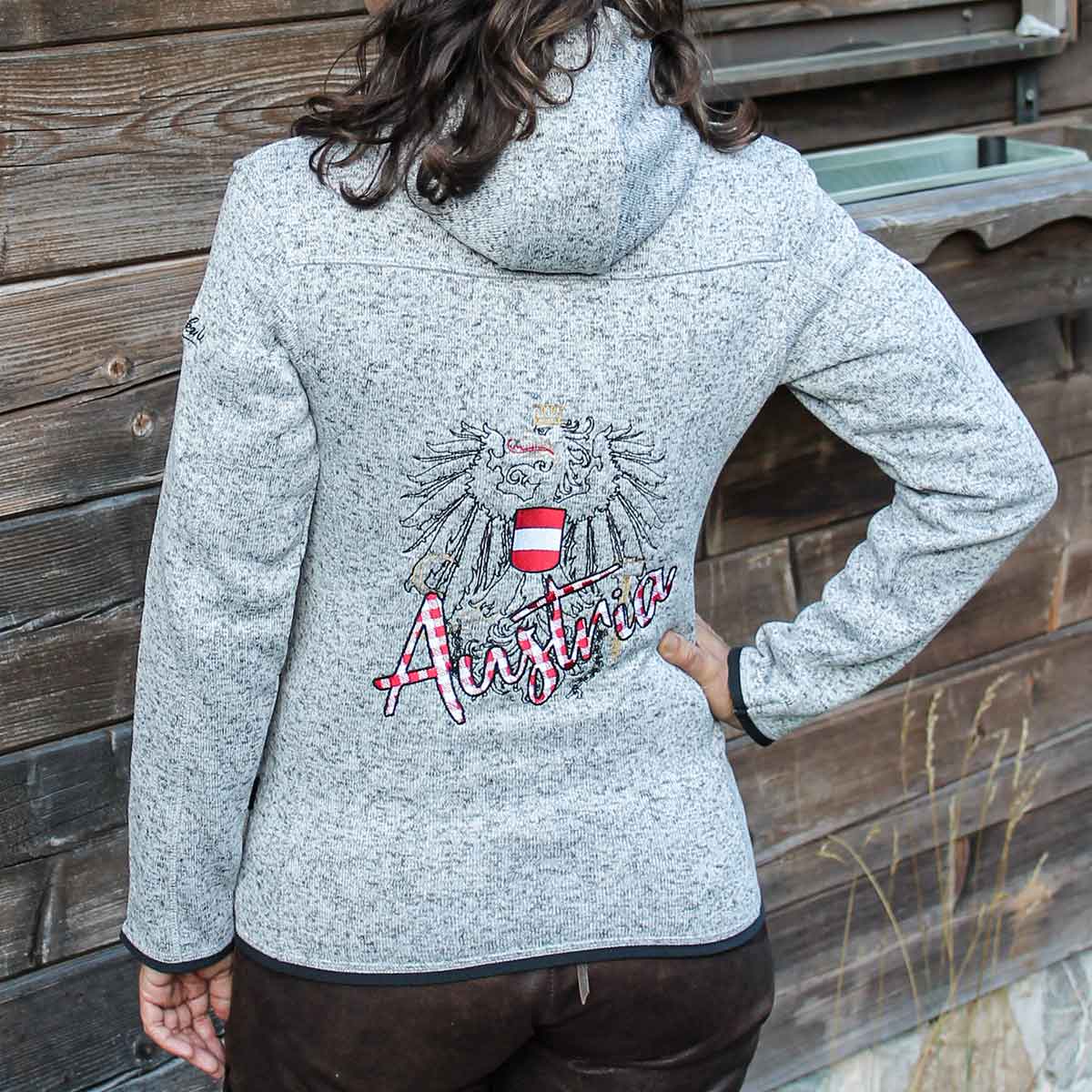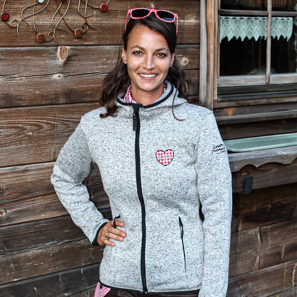 Tailliert geschnittene Strickfleece Jacke mit trachtigen Karo Stick Applikationen. Die weiche und wärmende Trachtenweste passt perfekt zur Tracht und ist ideal kombinierbar mit einer lässigen Trachtenbluse und Lederhose. Die karierte Strickfleece Jacke mit Kapuze wird in unserer hauseigenen Stickerei liebevoll veredelt und kann auf Wunsch personalisiert werden.