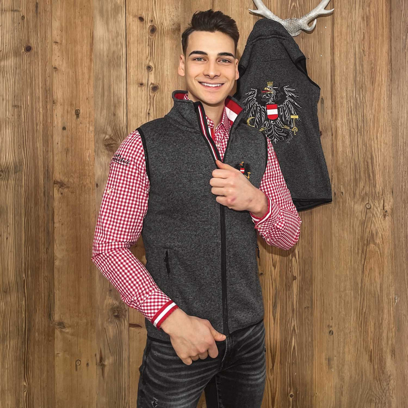 Das Österreich Adler Kultgilet aus kuschelig weichem und funktionalem Strickfleece sorgt für Wärme und Komfort in allen Jahreszeiten. Der rot-weiß-rote Stehkragen in Kombination mit der hochwertigen Österreich Adler Stickerei machen die Weste zu einem echten Hingucker. Ideal zum Wandern oder lässig zur Tracht - das Hoamatkult Gilet ist ein Must-Have für jeden Österreich-Liebhaber.