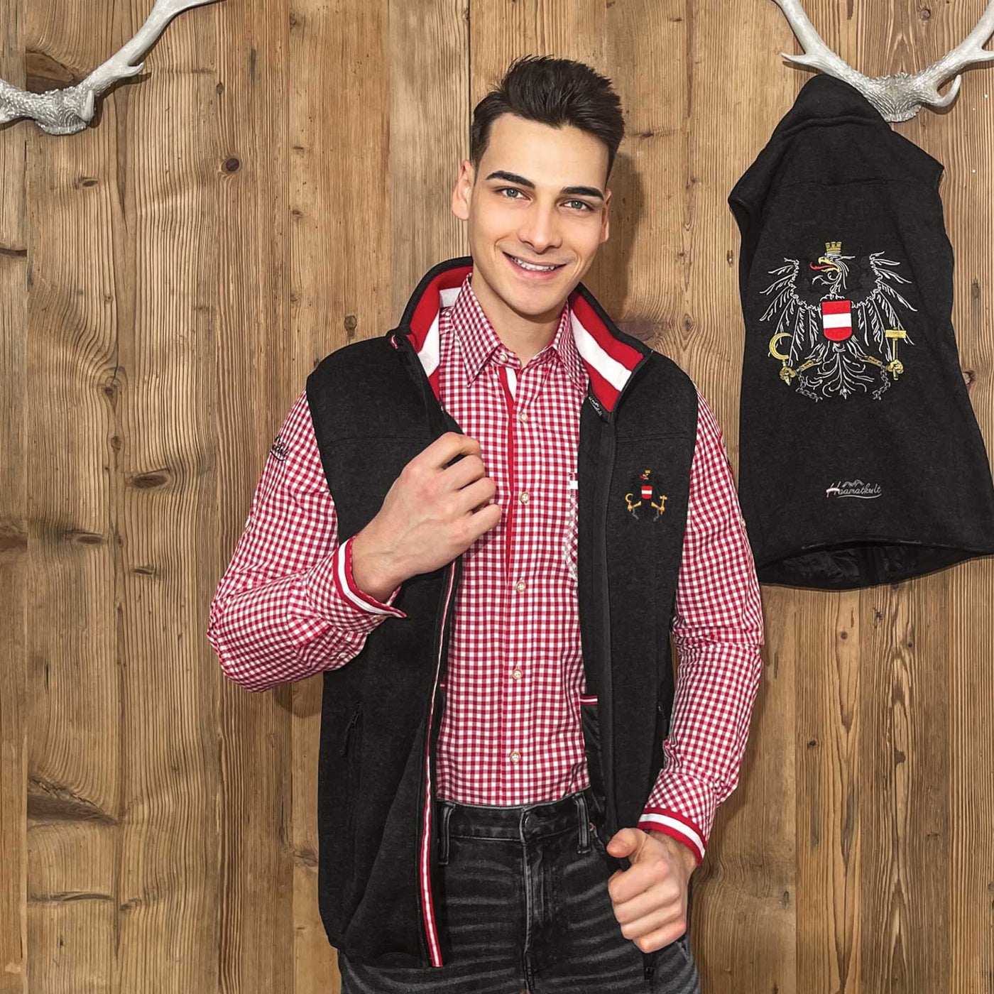 Einfach kultig und unverkennbar österreichisch - das originale Kultgilet von Hoamatkult. Gefertigt aus kuschelig weichem und funktionalem Strickfleece in melierter Strickoptik, garantiert die Österreich Adler Weste ultimativen Komfort in allen Jahreszeiten. Der charakteristische rot-weiß-rote Stehkragen und die hochwertige Stickerei des österreichischen Adlers verbinden Tradition mit zeitlosem Design. Perfekt zum Wandern oder als lässiger Hingucker zur Tracht, ist das Österreich Adler Gilet der Inbegriff von stilvoller Funktionalität.
