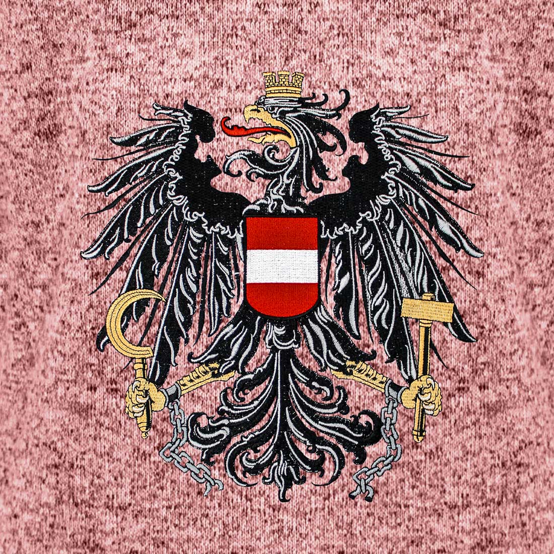 Das sanfte Altrosa in melierter Strickoptik verleiht jedem Trachtenlook einen Hauch von Charme. Die in Rosé gefärbte Kultjacke mit Österreich Stickerei ergänzt dein Dirndl ideal für einen beeindruckenden Prinzessinnen-Look mit Wow-Effekt. Dank des modischen, taillierten Schnitts für Damen und des weichen Fleece-Materials genießt du hohen Tragekomfort. Der fein gestickte Österreich Adler rundet das Design stilvoll ab.