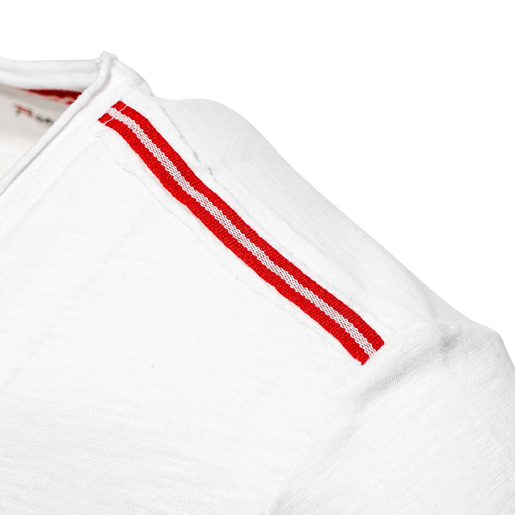 Die lässigen rot-weiss-roten Streifen machen das Designer T-Shirt zu einem echten Hingucker.
