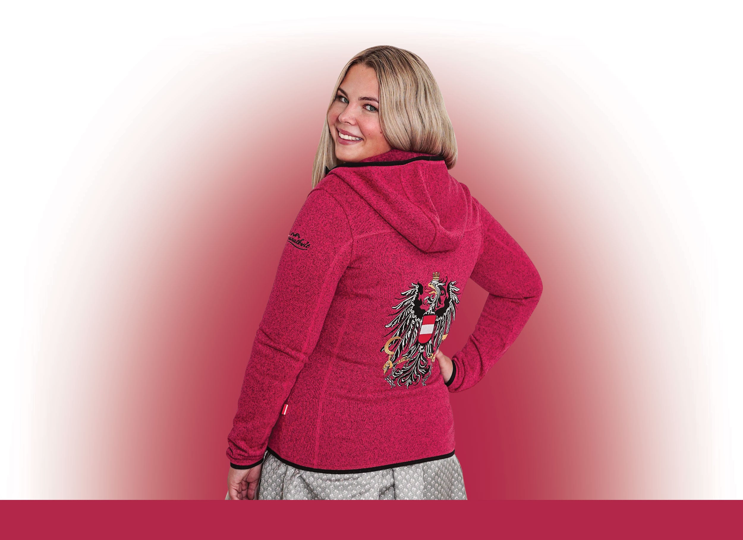 Die magentafarbene Österreich Kultjacke ist die perfekte Wahl zum Dirndl - für einen Look mit Wow Faktor. Der modisch taillierte Damenschnitt in Kombination mit kuscheligem Fleece sorgt für einen besonders angenehmen Tragekomfort. Der strahlende Magenta Farbton wird durch den fein gestickten Österreich Adler stilvoll abgerundet. Die Österreich Kultjacke ist perfekt für Wanderungen und der ideale Begleiter durch alle Jahreszeiten.